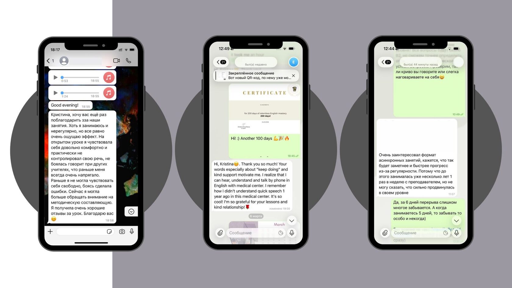 Мы начинали заниматься офлайн, когда ученица ещё была в декрете. Но с выходом на работу времени на английский у неё стало катастрофически мало. И мы перешли на асинхронный формат. Почти все задания ученица делала из кровати поздно вечером, когда укладывала ребёнка спать. В голосовых сообщениях, которые она записывала тихим голосом, мне часто было слышно, как ребёнок сопит рядом =)